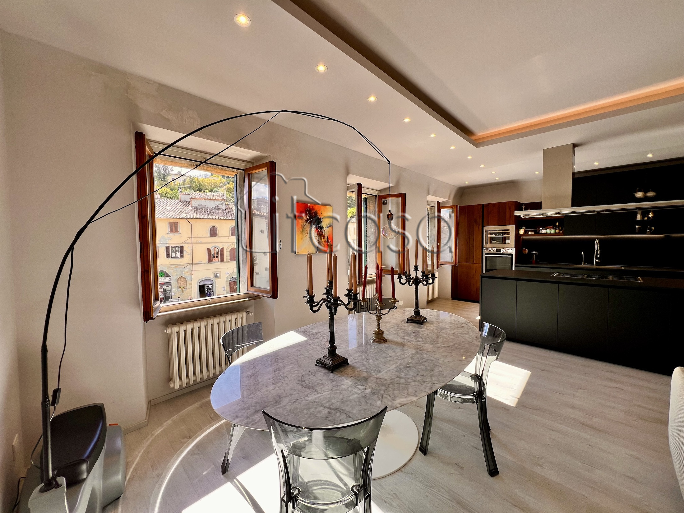 Open plan modern living space with Piazza views, Appartamento Garibaldi, Anghiari, Tuscany