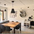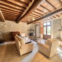 The living room is to the left of the kitchen with large glass doors leading to the outdoor dining area with views onto the garden. This spacious room has wood beamed ceilings and a stone feature wall plus a pellet stove for ambience and an additional heat source.