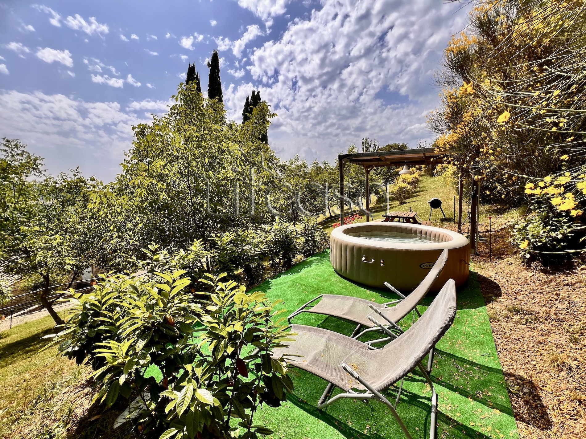 Sono inclusi un giardino privato con idromassaggio e 2 posti auto assegnati. C’è anche un terreno comune dove si potrebbe realizzare una piscina da condividere con i 4 appartamenti.