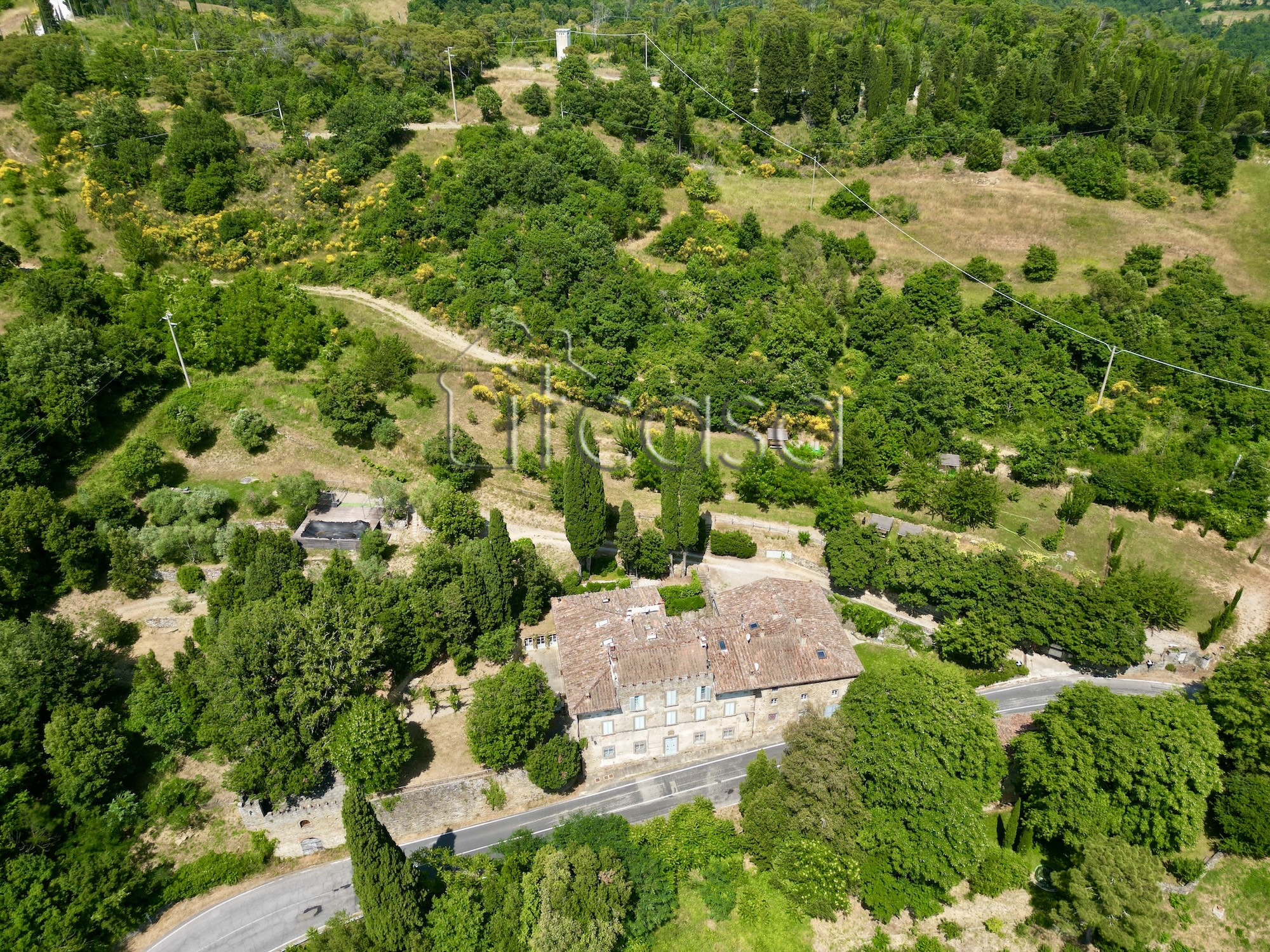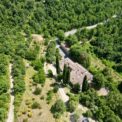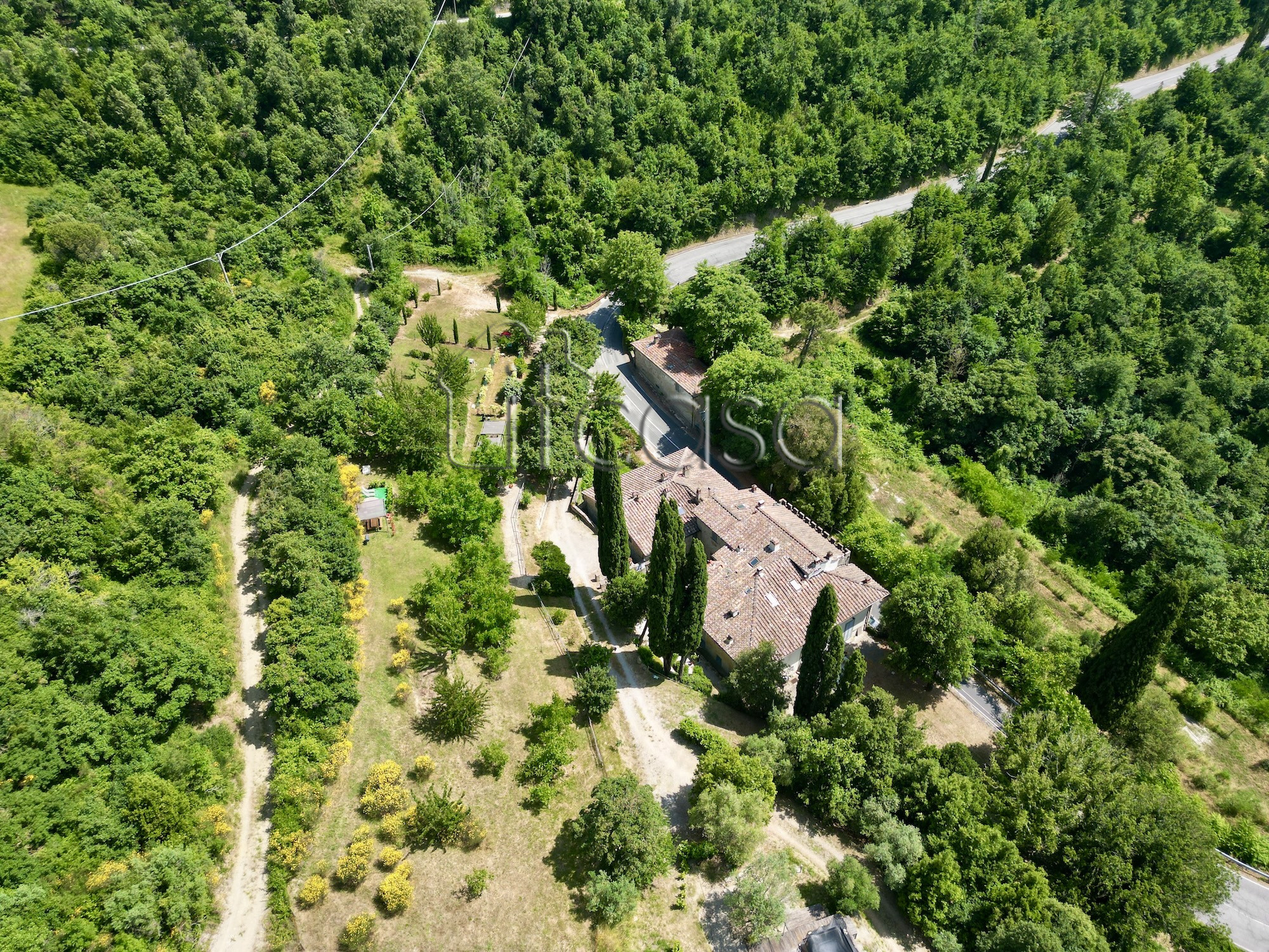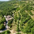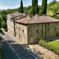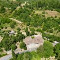 Aerial image of the stone farmhouse showing the roofs and surrounding land near Anghiari, Tuscany.